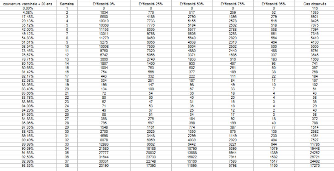 En estimant une efficacité nulle (cas proportionnels à la couverture vaccinale : exemple si 100 cas ce jour là et CV 30% alors 30 cas vax et 70 non vax)