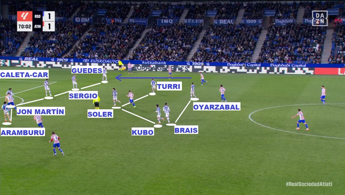 Y este es Aritz disponiéndose a conectar con Isak segundos antes del 1-1, buscando la espalda de un doble pivote rival que en bloque medio-bajo mordía fácil el anzuelo