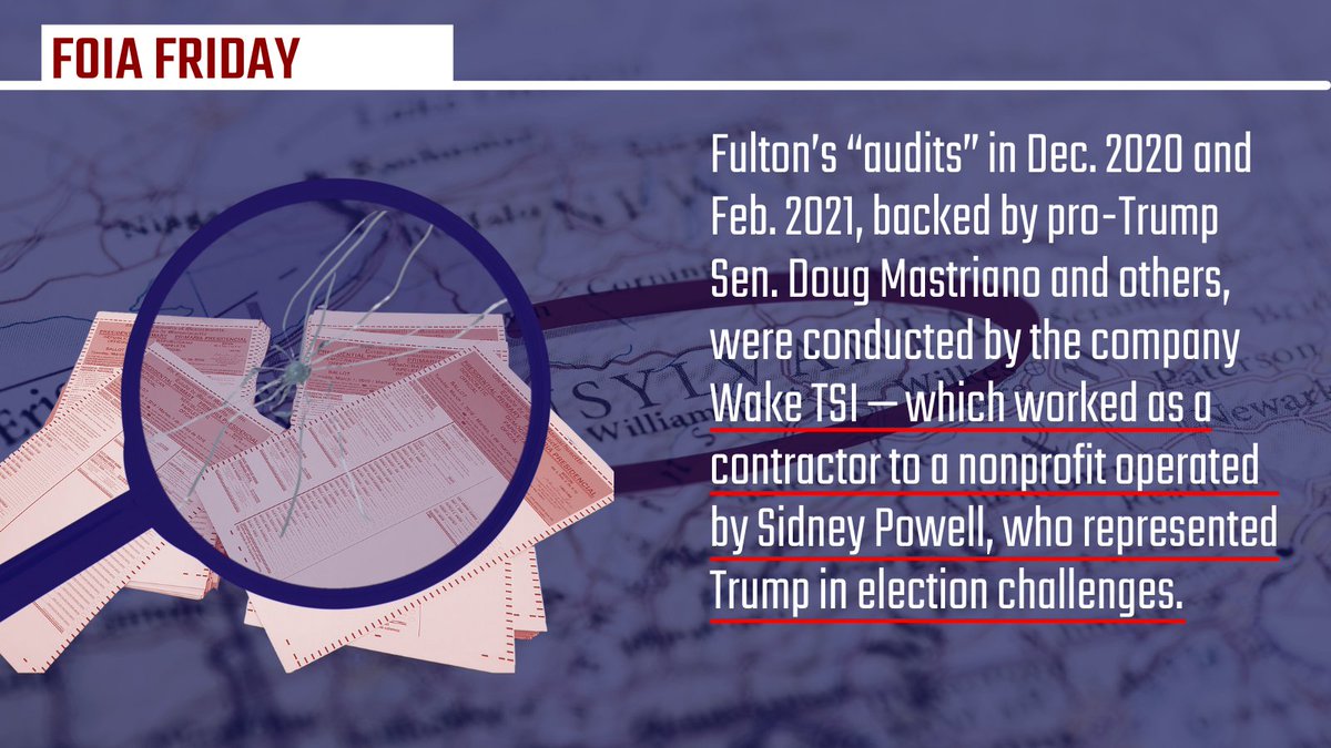 Fulton’s “audits” in Dec. 2020 and Feb. 2021, backed by pro-Trump Sen. Doug Mastriano and others, were conducted by the company Wake TSI — which worked as a contractor to a nonprofit operated by Sidney Powell, who represented Trump in election challenges. azmirror.com/2021/05/24/gro…