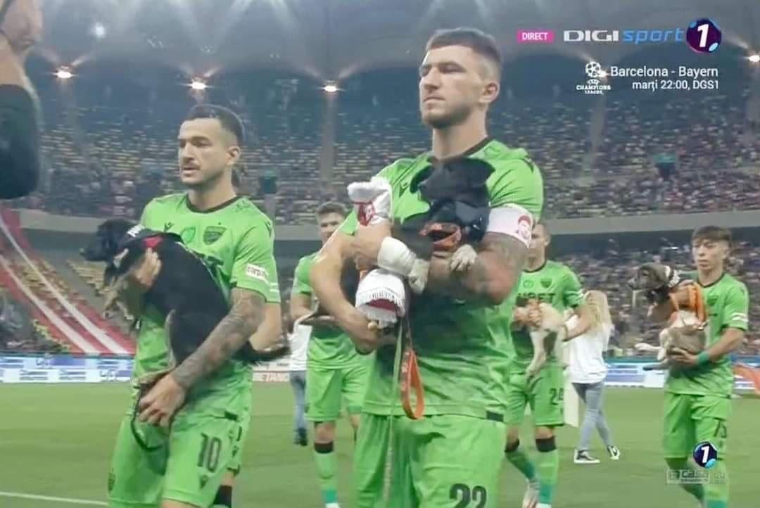 No último clássico contra o FCSB, o Dínamo de Bucareste entrou em campo com cachorros para estimular a adoção.