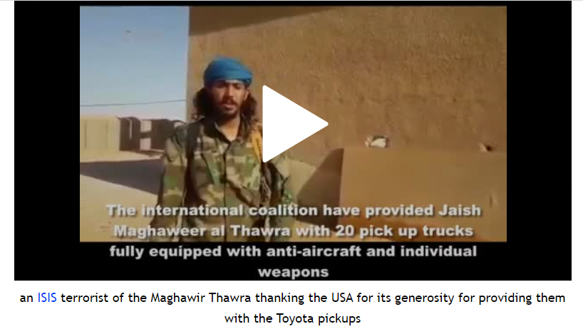 An ISIS terrorist of the Maghawir Thawra thanking the USA for its generosity for providing them with the Toyota pickups