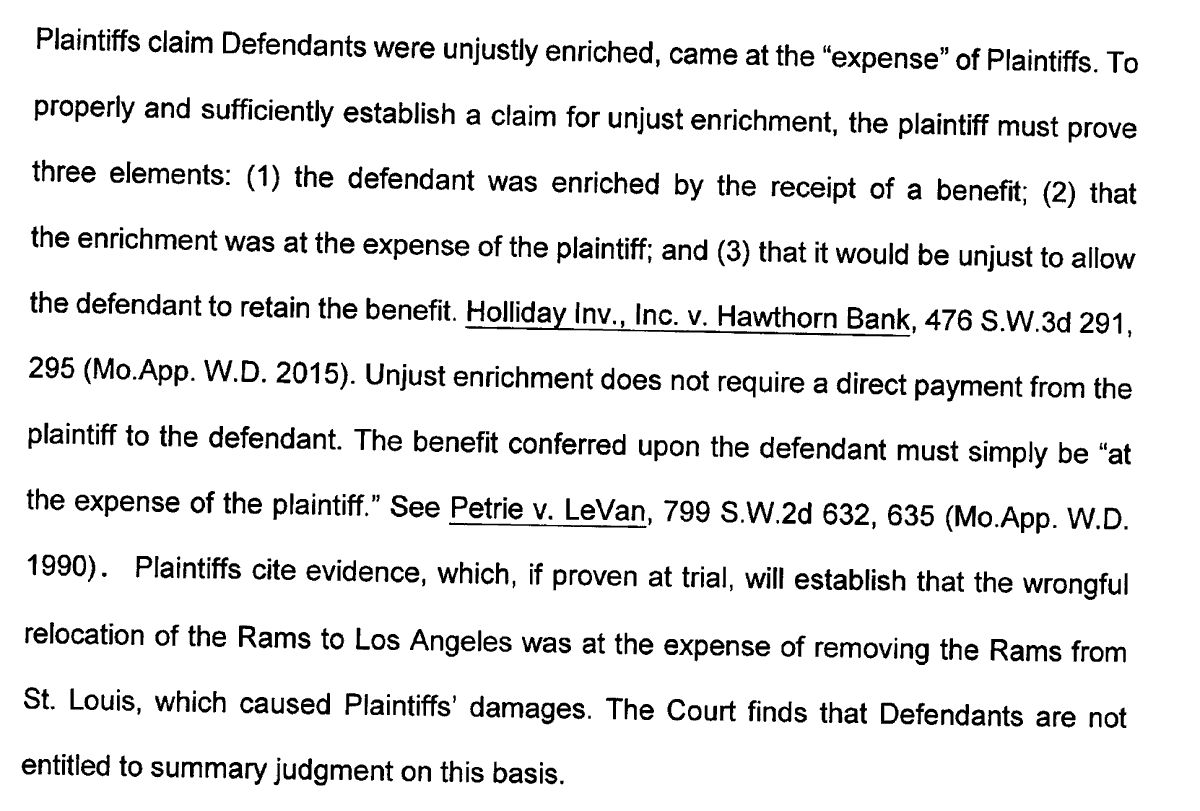 One final thought about compensatory damages. Can the City recover as its damages for unjust enrichment a disgorgement of the NFL's relocation fee and the increase in franchise value due to the LA move. Missouri law and judge's pretrial rulings suggest that the answer is "yes."⤵️