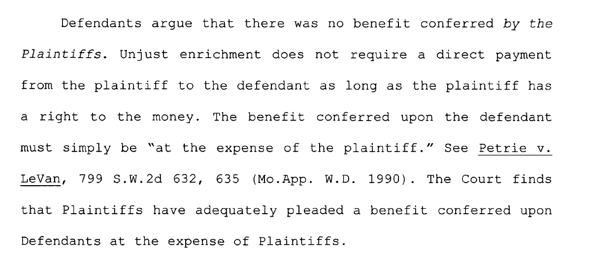 A key ruling from the Missouri court on summary judgment: damages on unjust enrichment are not tied to "direct payments" made by a plaintiff. The benefit conferred must simply be "at the expense of the plaintiff." This puts relocation fee and increase in franchise value in play.