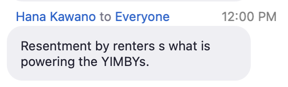 A NIMBY in the chat accidentally says the quiet part out loud, worries that if Livable focuses on supposed "affordable housing" efforts, they won't be able to get rid of SB9 and SB10.
