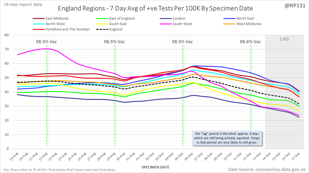 #covid19uk - Detailed positive tests thread. The majority of this thread is a set of views of rolling 7 day average positives per 100K by specimen date. Starting with England regions: