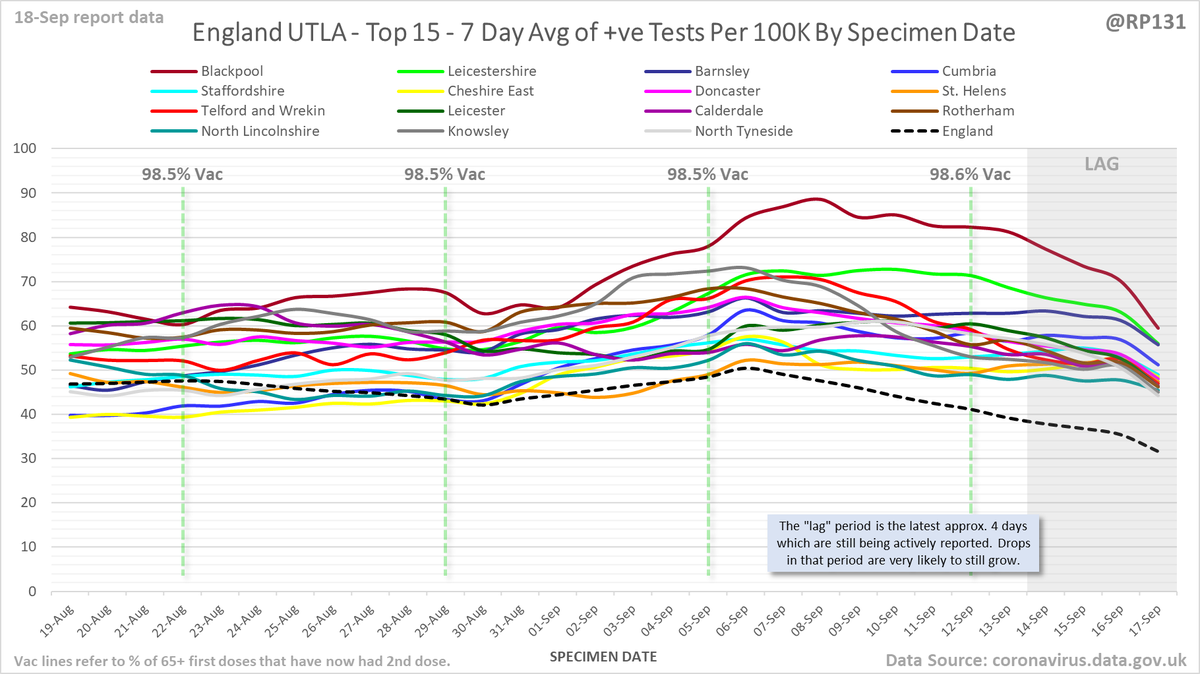 Rolling weekly comparison of totals up to 3 days ago. This chart is useful to see the relative movements of the local authorities towards the top of the list.