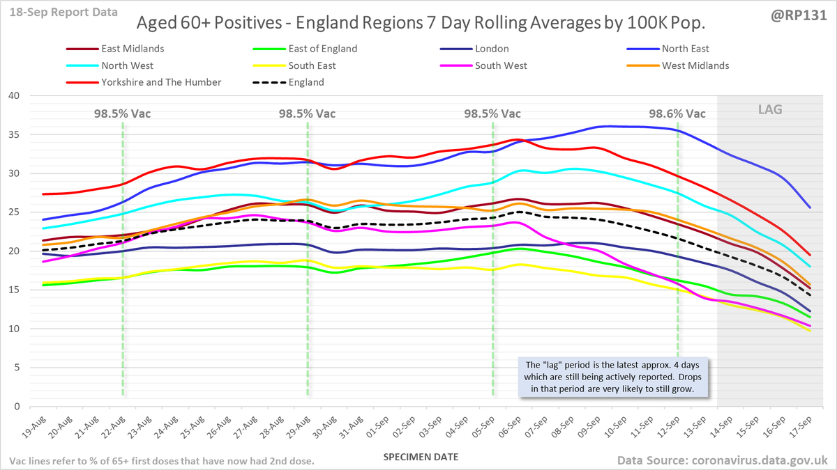 England regional rolling average positives (per 100K population) in the 60+ age range:
