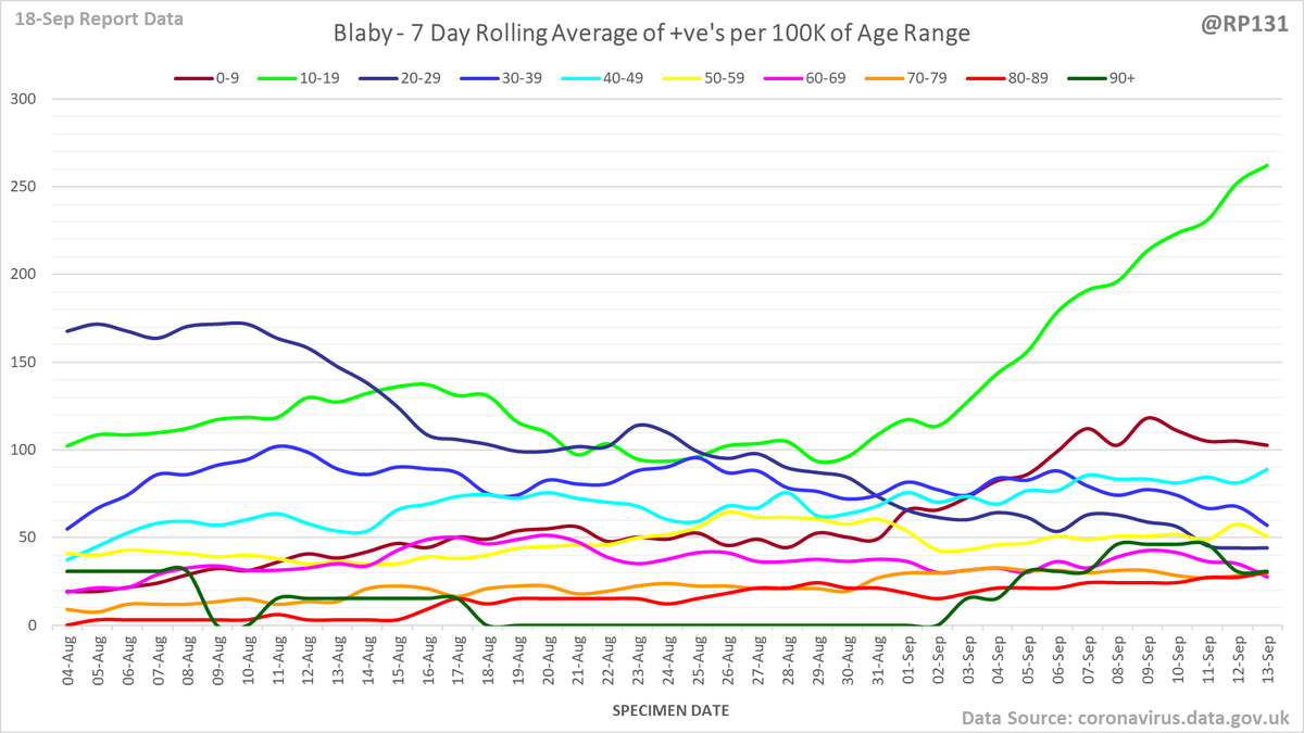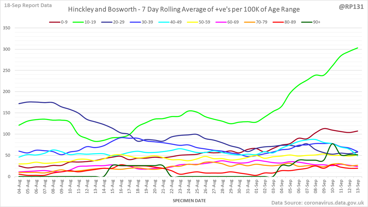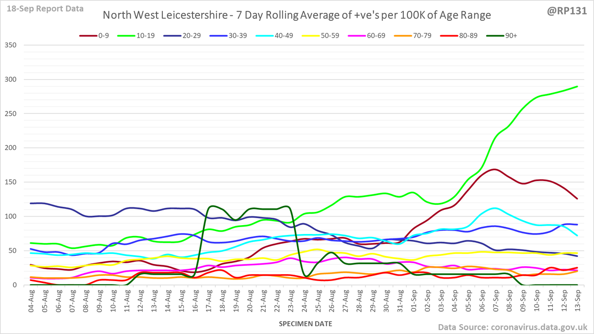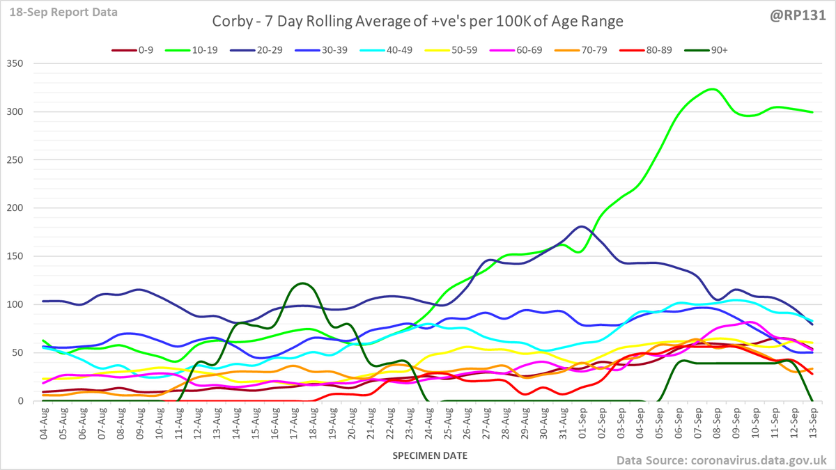 Age breakdown chart for Corby (current top LA). Rolling average of positive tests by specimen date per 100K population of each age range.