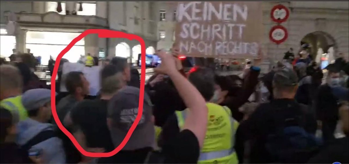 Ebenfalls identifiziert werden kann der Mann im Hintergrund mit dem Filzhut und der Schweizerfahne. Nebst der Tatsache, dass er kaum ein "Antifa" sein dürfte, findet man ihn in einem Livestream wieder. Er lief beim Käfigturm neben den Trychlern (Quelle: ).