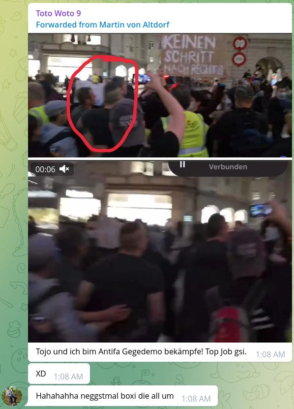 Und zwar der Telegram-User "Toto Woto 9". Dieser war bereits an der Auseinandersetzung am Bärenplatz beteiligt. Als die Gegendemonstration dort die Strasse blockierte, half der sehr aggressiv auftretende Mann, sie zu "bekämpfen". Damit prahlte er später in einem Telegram-Chat.
