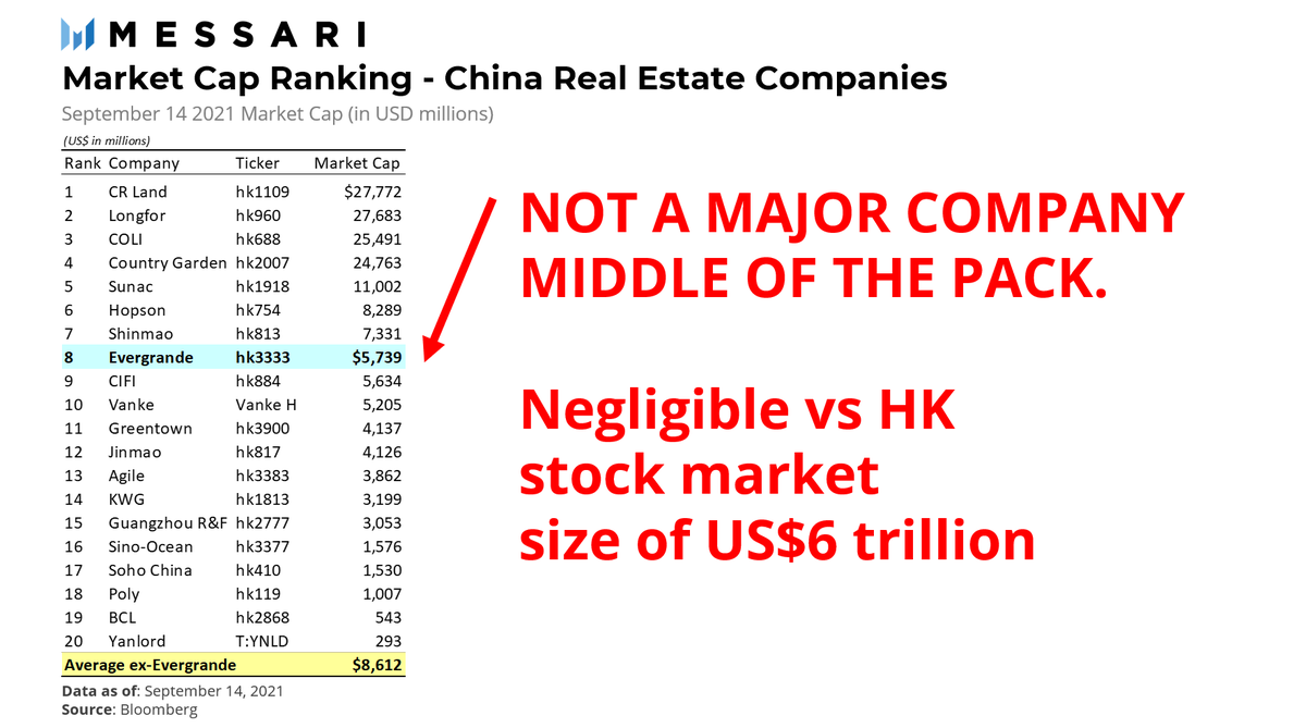 Equity Market impact: Evergrande's stock has *already* dropped -85% (1 year), pricing in cash flow issues. Its market cap of $4bn isn't a systemic risk. Crypto has seen a bull market despite a China property selldown --> No Correlation
