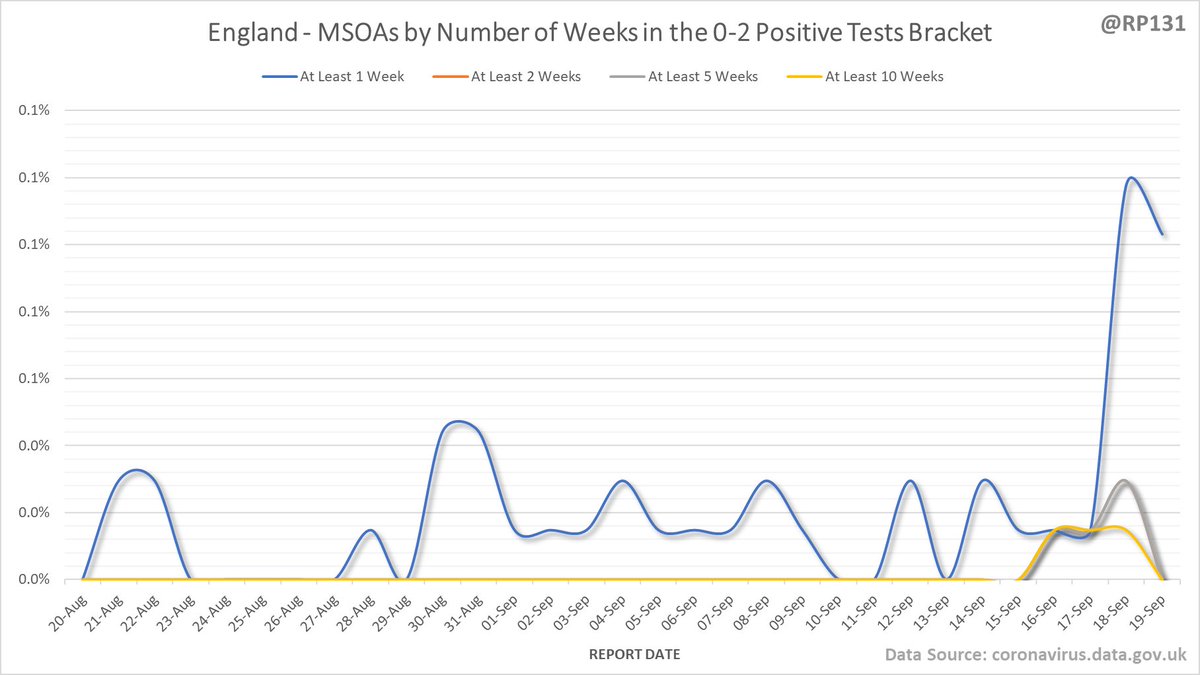 Bringing back the view of how many weeks the MSOAs have been in the suppressed 'less then 3 +ves in the last week' category. Since they don't allow us to distinguish between zero / 1 / 2, we generally consider it to mean zero. Link to full table in reply below.