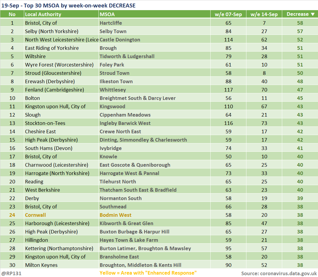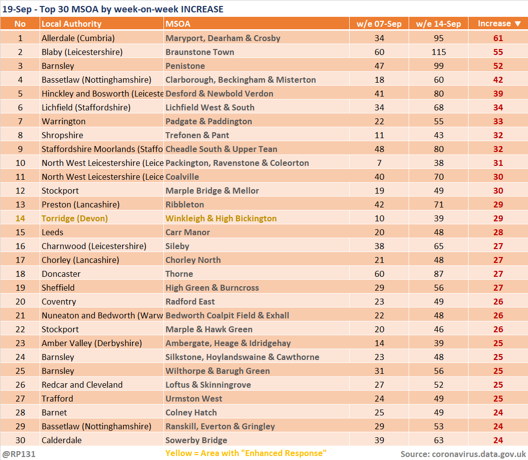 Updated (19-Sep) table of top 30 MSOAs (by rate) based on latest numbers in today's report.