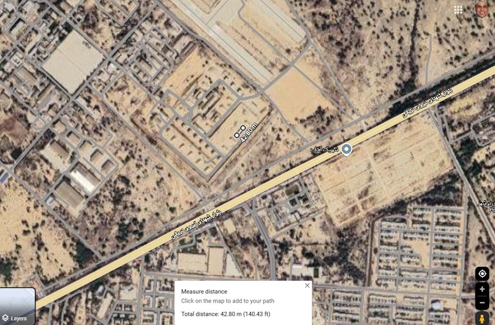 @MihaiFl85264914 @cirnosad As far as I know, nobody has published estimated dimensions for this 7 March 2026 Bushehr airbase crater. Using Google Maps I was able to compare the diameter of the crater to another object in the image of the same length and came up with a crater diameter of 42.8 m (140.4 ft).