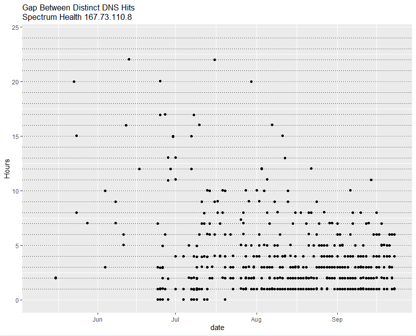 Look at this data. In the Spectrum Health subset, I've isolated subset of "distinct DNS hits". (Hits are repeated multiple times within a second or two, then a pause for a multiple of one hour plus a small delta. In subset from Aug 7 to Aug 12 (and looks like more generally),