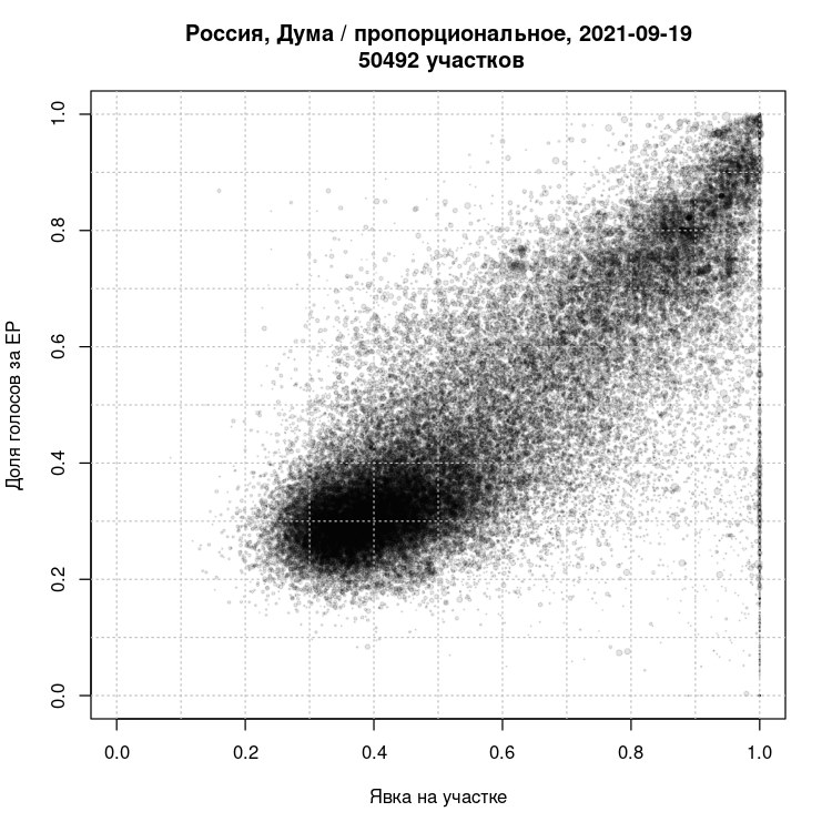 One method that has proved popular among Russian political scientists is to compare overall turnout with vote share for the ruling United Russia party in each and every individual polling station (almost 100,000 across the country). (3)