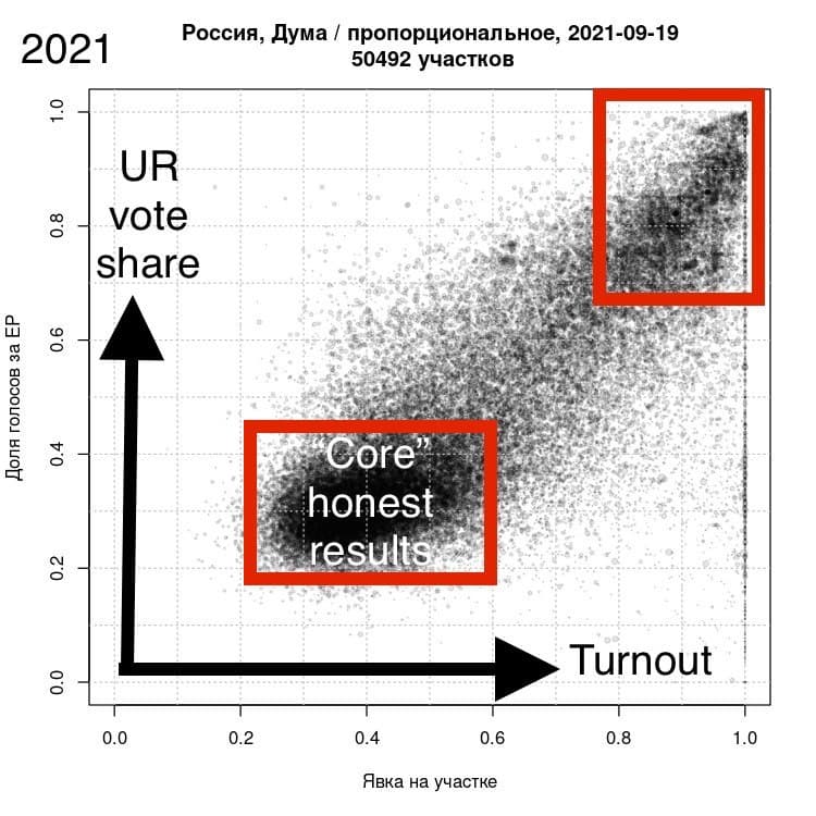 The big bulk of results where turnout is 30-40% and support for United Russia is 25-40% is seen as the “honest core” — the polling stations where, the analysis goes, there was likely no or little falsification. (7)