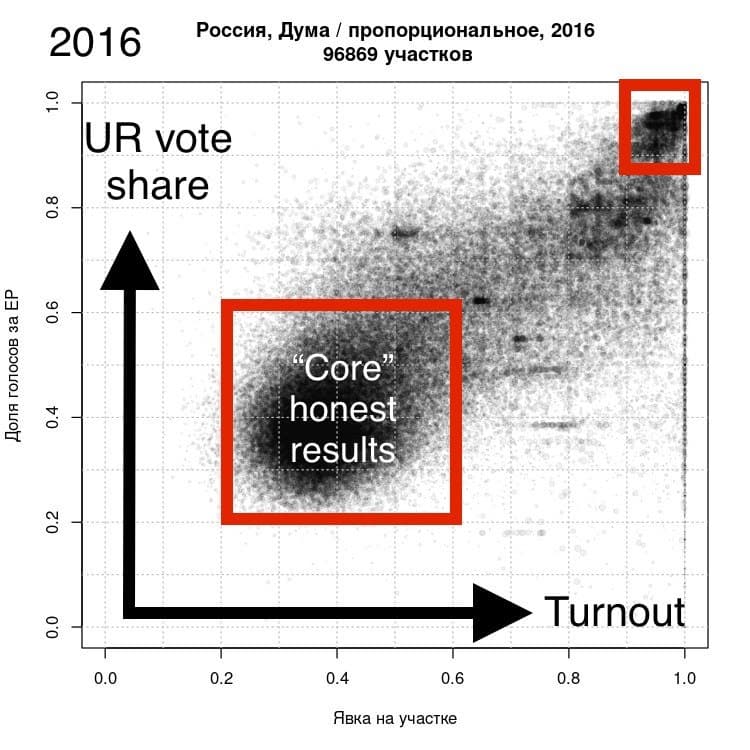 In a fair count, the argument goes, there should be a much weaker correlation, a much messier graph, many more polling stations where turnout is high and UR support is low and also vice versa. (10)