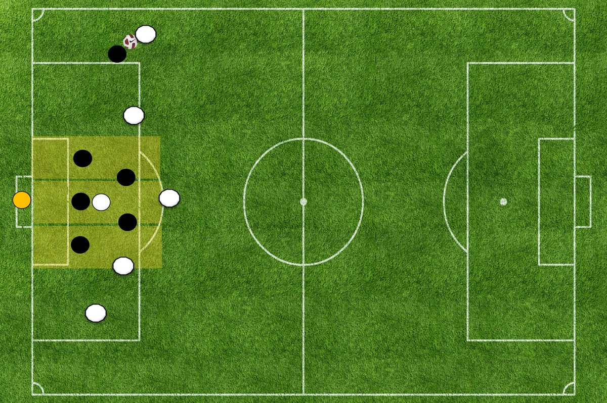 En este caso, los defensores de los posibles receptores se colocan en zona, referenciándose con la portería: 1er palo, centro y 2º palo y si es posible alineados como mínimo a la altura del balón para poder ver el centro de cara, con 2ª línea cerca: 3+1 o 3+2