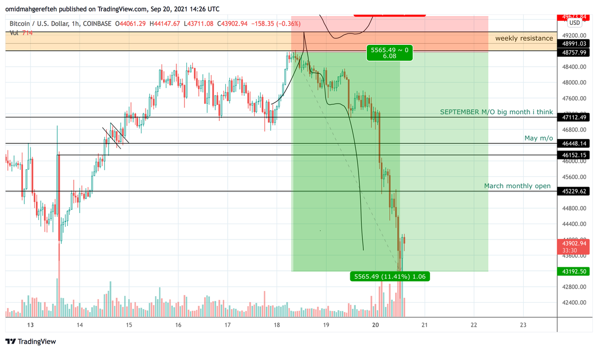 #BTC dropped $2000 towards $46,800 and we reached the September monthly open. I decided to exit my trade because every time we tested this level, there was a big bounce. However, I did not factor in the amount of times it was tested, and the fact that my target was 10% lower.