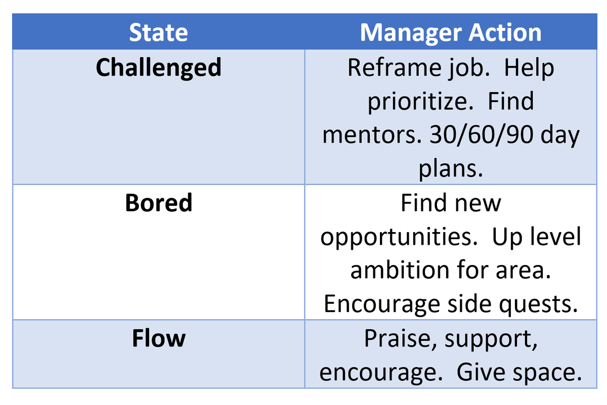5/ I find 40% of team is in the flow on average. 20% in challenge territory and 20% boredom danger - both of those require plans to fix. A final 20% is in challenge but that's OK - they are finding their flow on a stretch project. Here's a table on action plan:
