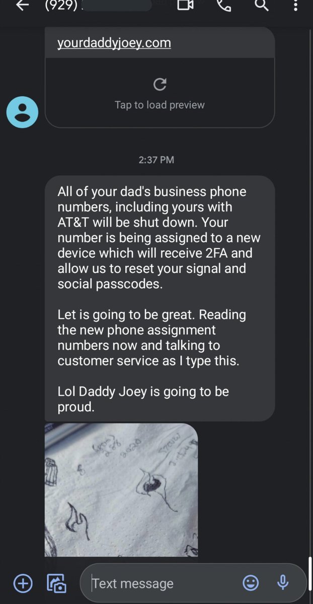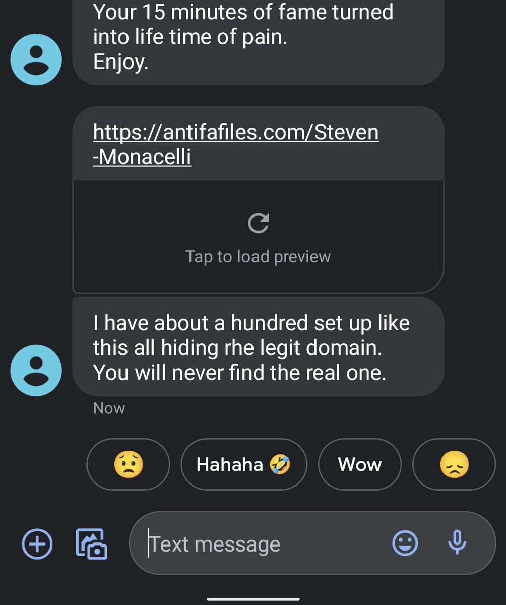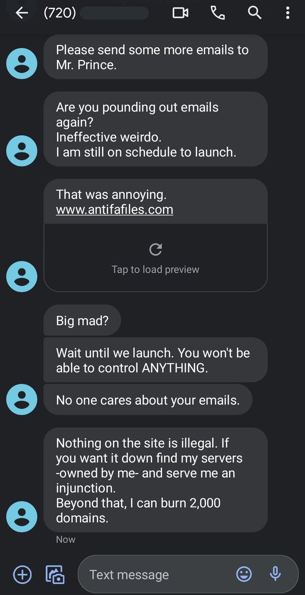 A different number, but clearly an associate or fan of Camp's, threatening to defame me as a Nazi