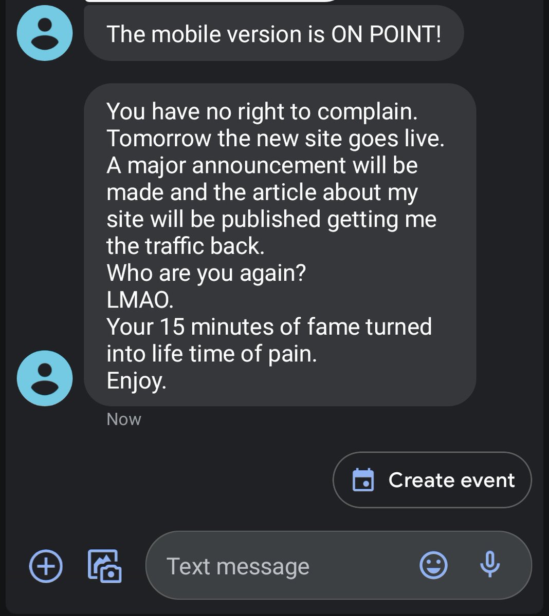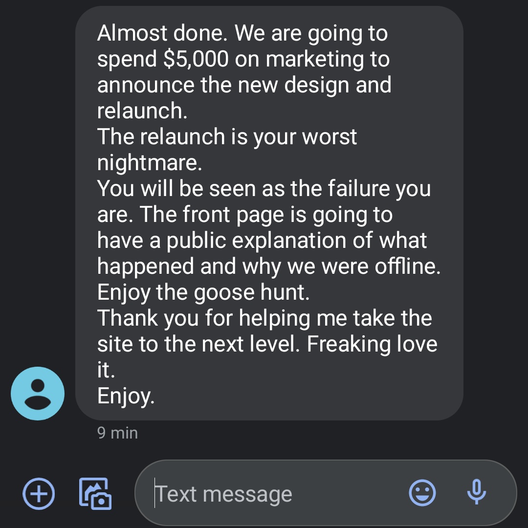 More documentation of Camp's continued messaging me, despite explicitly telling him to stop days ago.