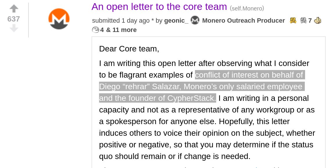 8/ Does @fluffypony have anything to say about this egregious behavior by Monero's *only* employee? Someone whom was hired when @fluffypony was the *lead* maintainer of Monero?