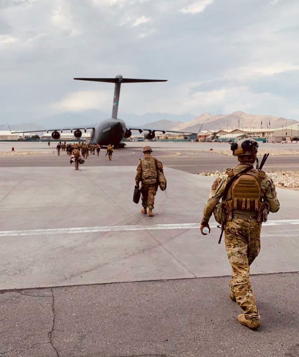 The last airmen assigned to the 621st Contingency Response Wing rally to a Boeing C-17 Globemaster III to leave Hamid Karzai International Airport last month. (Undated U.S. Air Force photo)