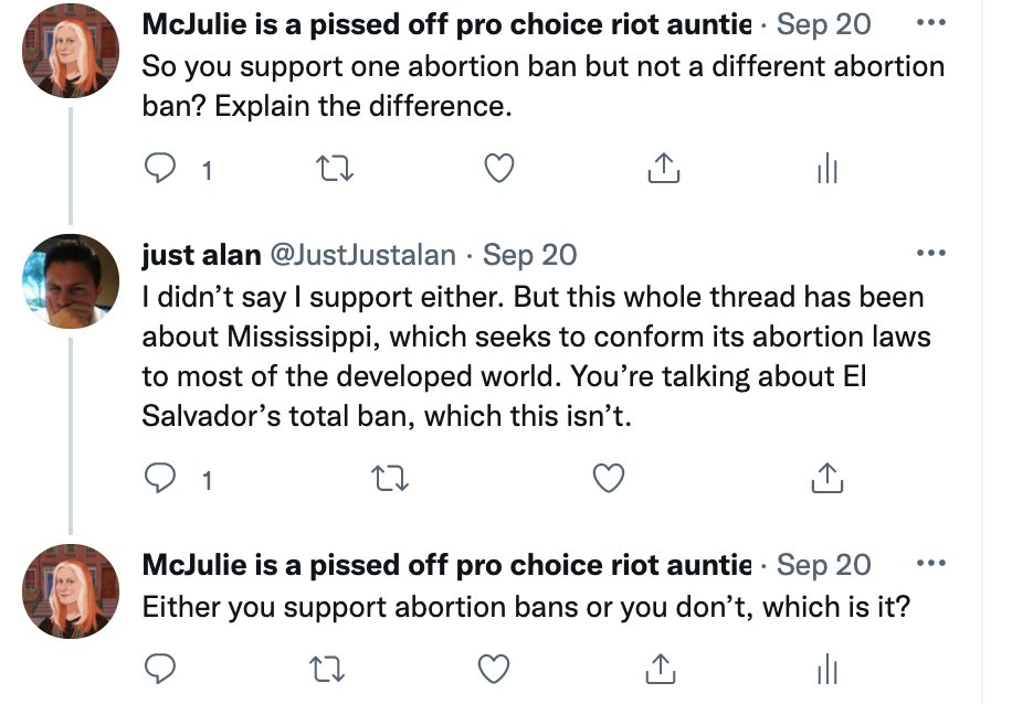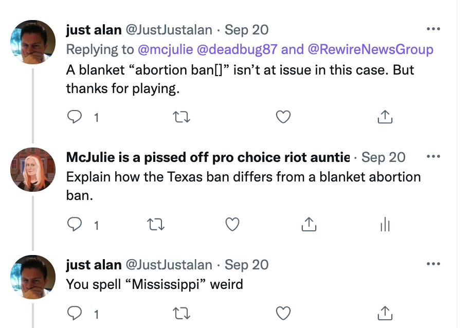 He -- and I use the pronoun loosely, the actual Twitter entity could be three ducks in a trenchcoat for all I know -- wanted to get me stuck arguing whether abortion bans in Texas & Mississippi are technically "bans" or whether there's meaningful difference between TX & MS.