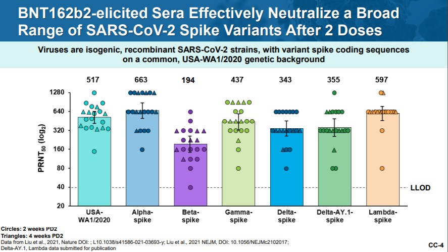 Η πρώτη παρουσίαση από τον Αντιπρόεδρο της Pfizer, Will Gruber. Δεδομένα αποτελεσματικότητας εμβολίου στις 2-4 εβδ μετά την 2η δόση, έναντι της ακίδας διαφόρων παραλλαγών.
