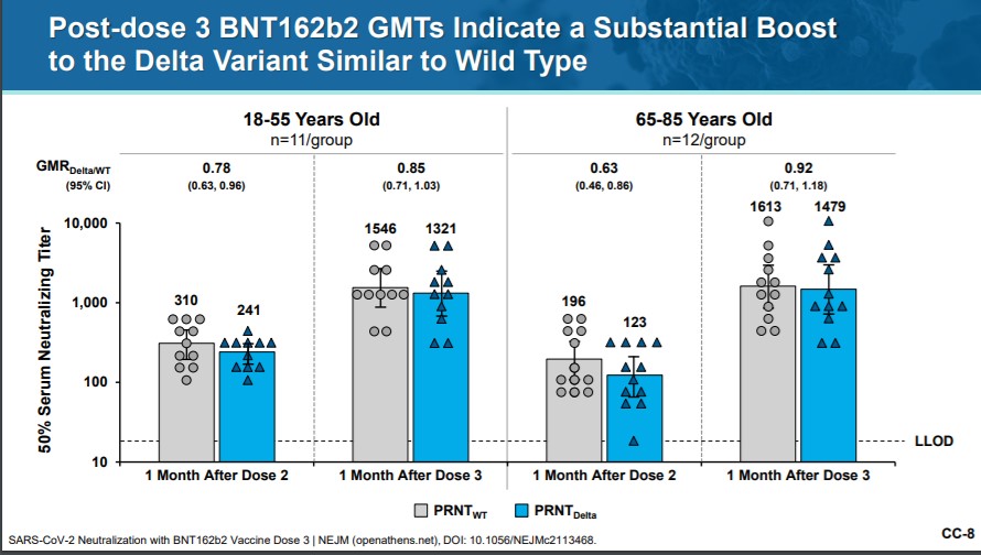 Τα ικανά αντισώματα αυξάνονται 3x φορές περισσότερο μετά την 3η δόση, από όσα υπήρχαν μετά την 2η δόση (τεστ εξουδετέρωσης: από 753 -> σε 2476 GMT).