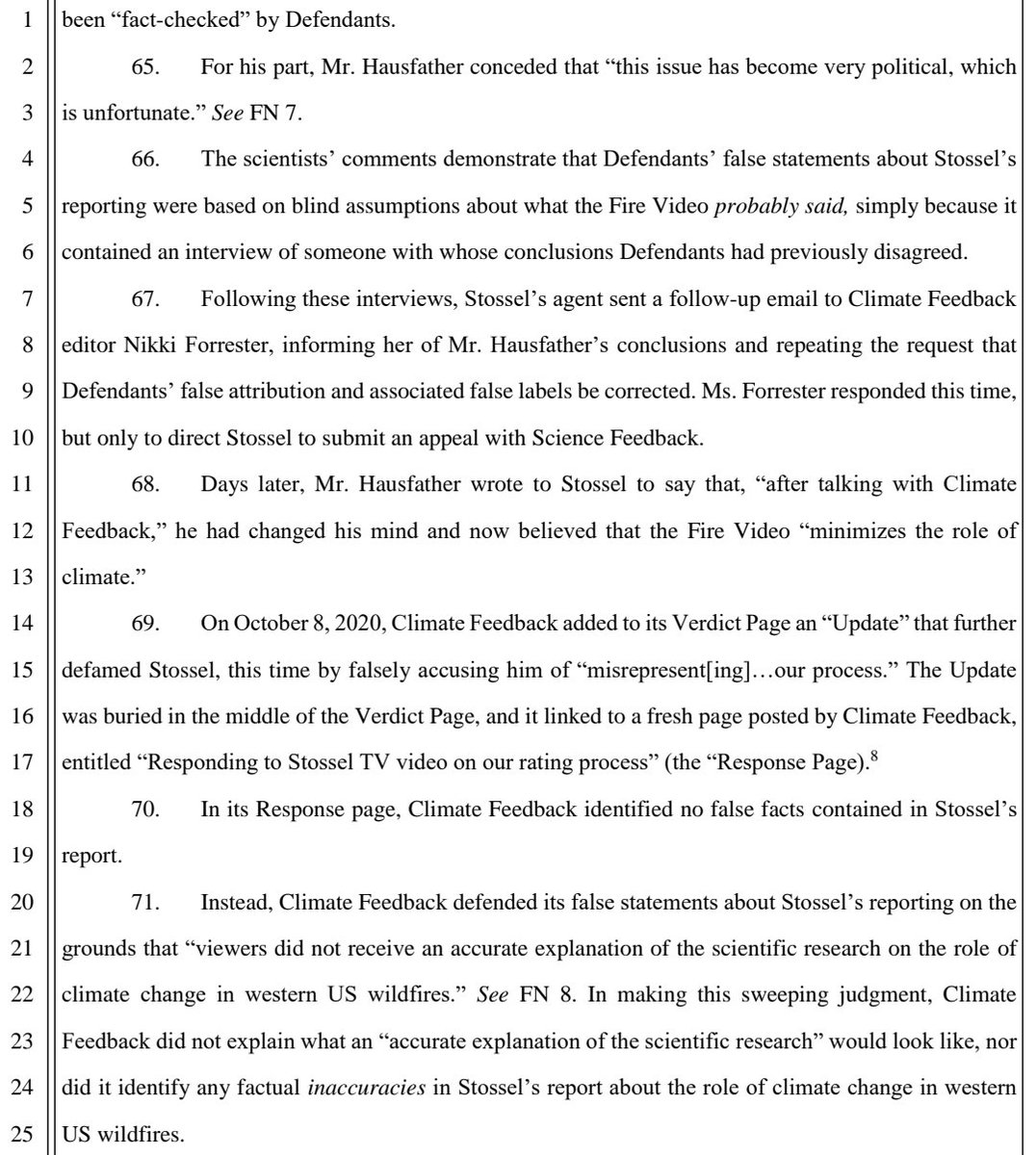 The defamation suit centers on a video posted by Stossel on California wildfires that ostensibly blames forest mismanagement as well as climate change. The Climate Feedback group fact-checked a claim he did not make, and dinged his video as misleading & missing context.
