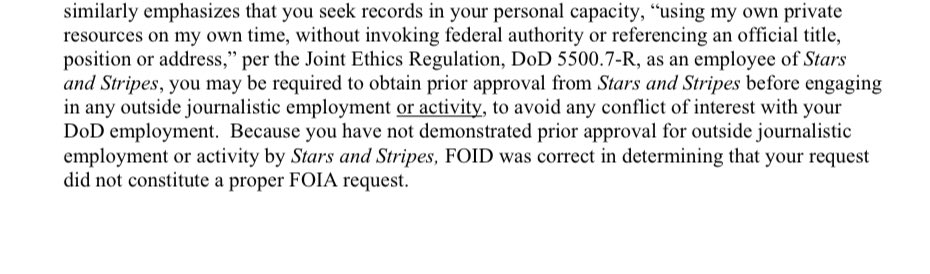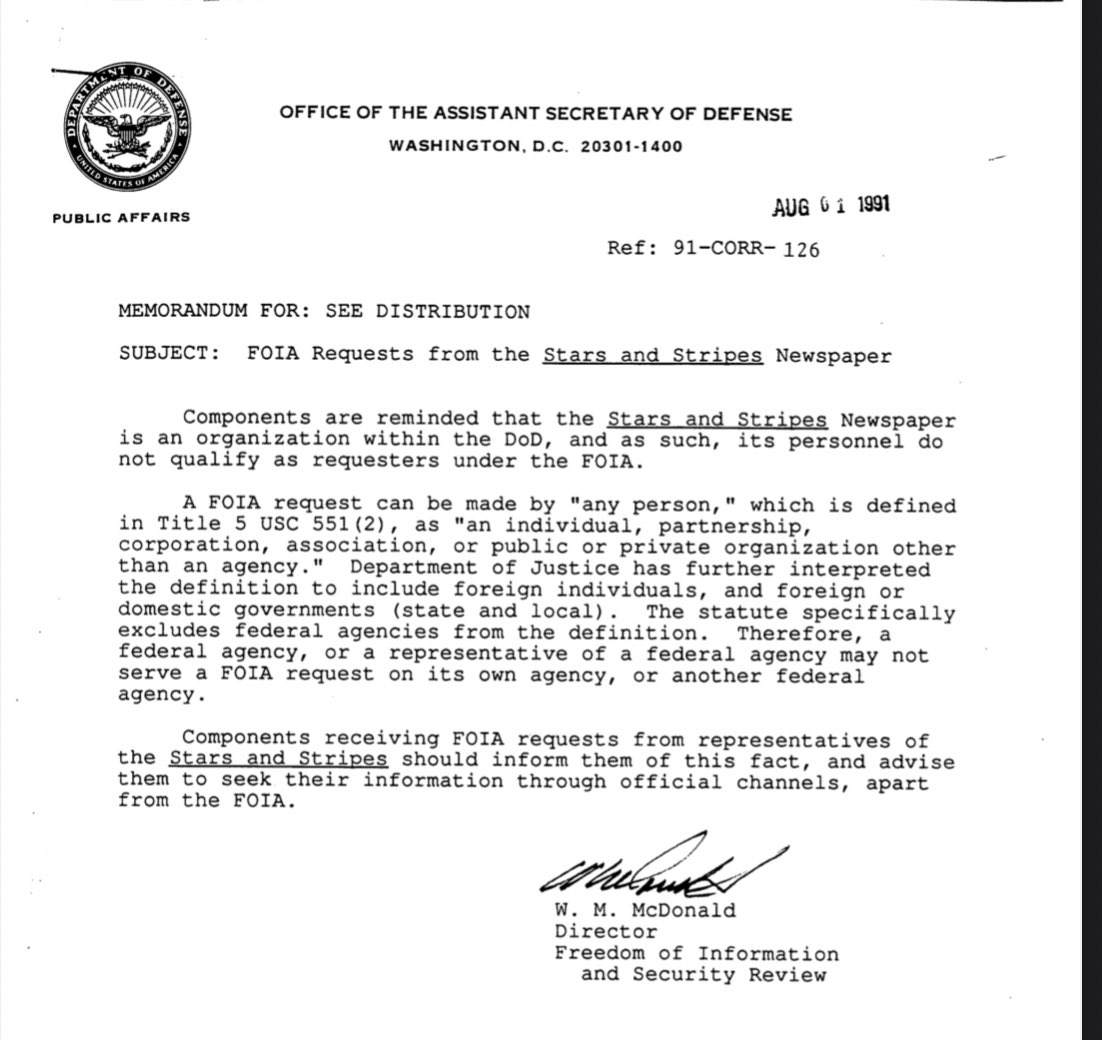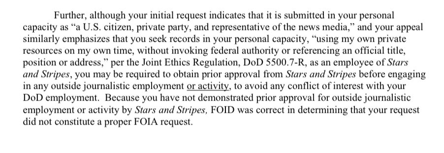 Note that the above DOD memo was issued in 1991 and is vaguely worded. It doesn’t say explicitly that S&S reporters can’t file FOIA requests in a personal capacity, but it suggests they can’t & are disqualified merely for being S&S employees — & that’s how its interpreted.