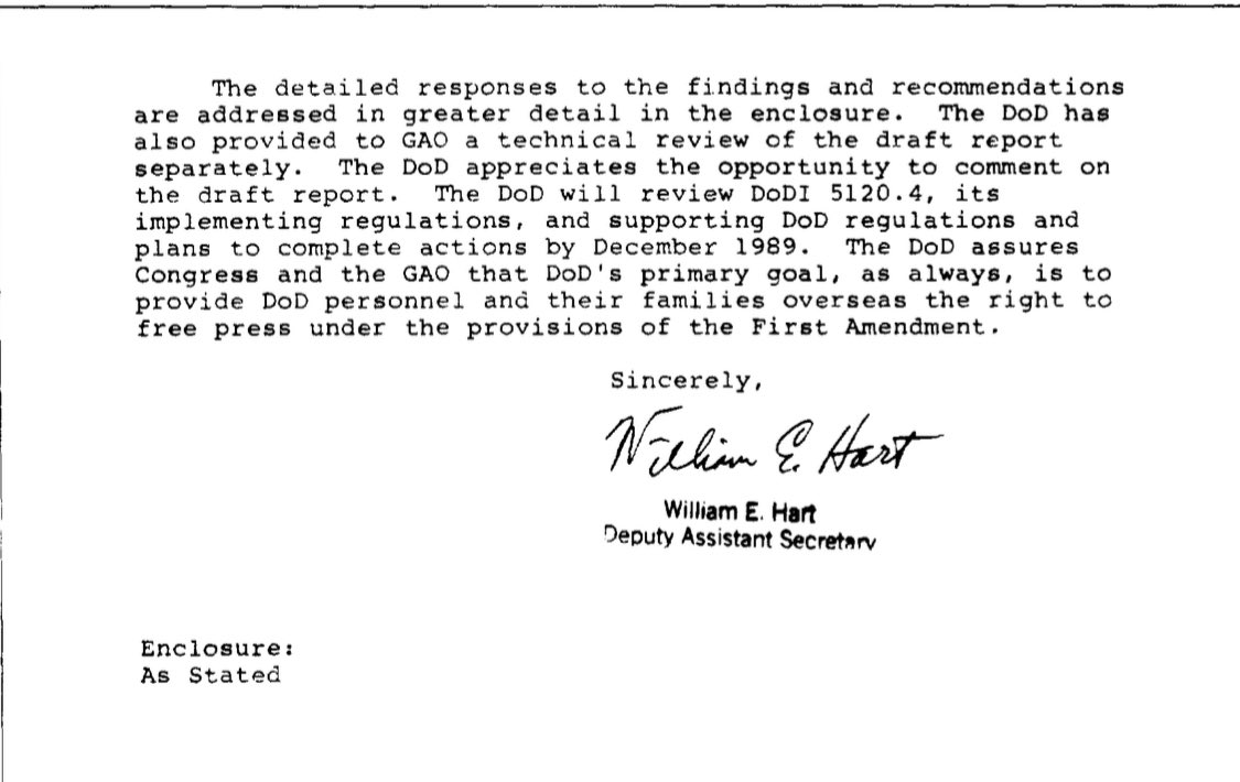 So why is it that the this memo came in 1991, just THREE YEARS after a GAO investigation established credible basis to support allegations of DoD’s undue influence on S&S content and a pledge to Congress from DOD’s top Public Affairs dude saying it would amend its ways?