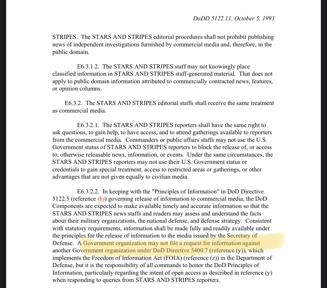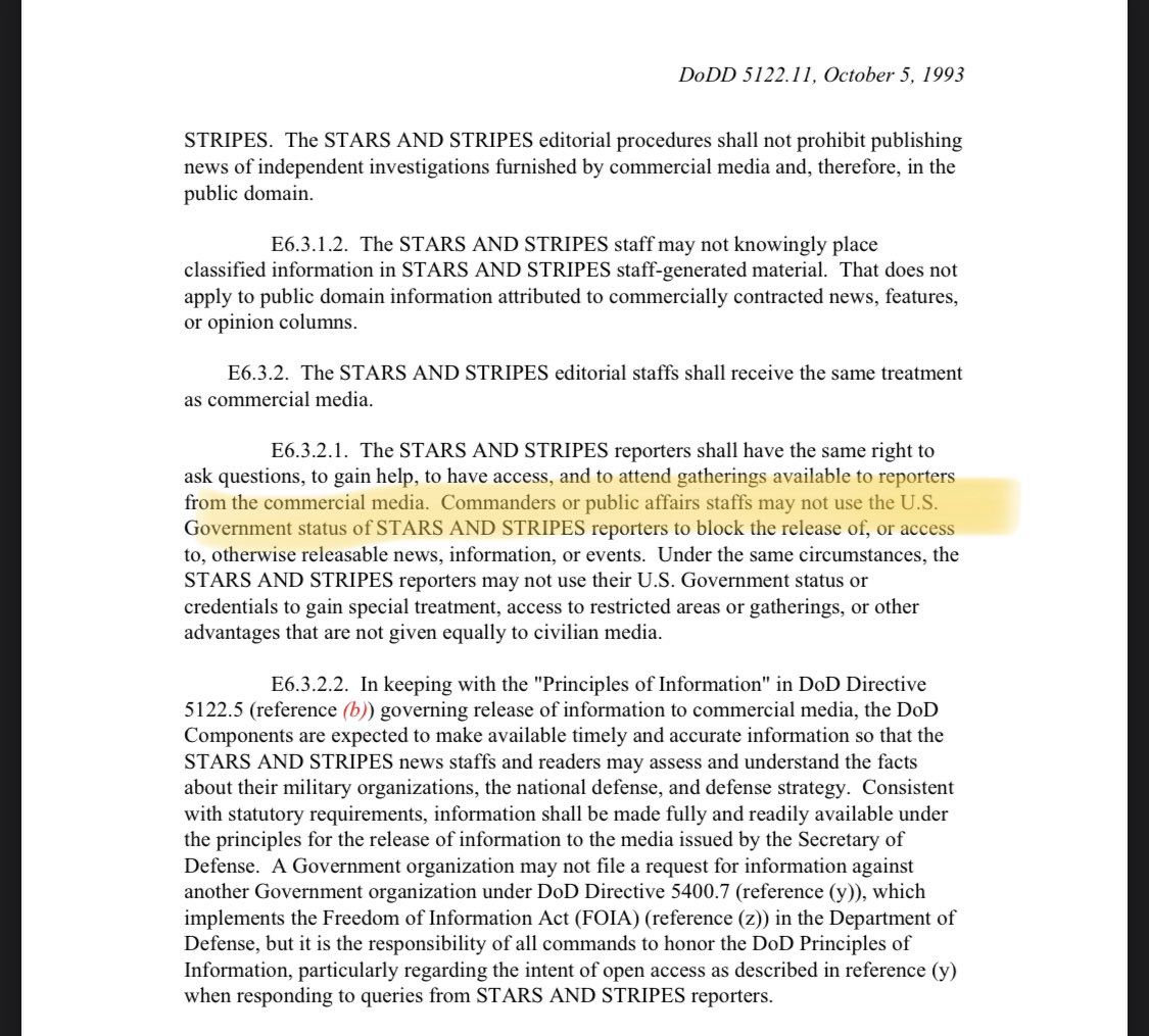 As noted above, DoD Directive 5122.11 doesn’t let DoD deny S&S reporters access bc of US Gov status — but it also prohibits S&S reporters from using that status to gain access not offered to commercial news media. So S&S reporters have no “official” access to use.