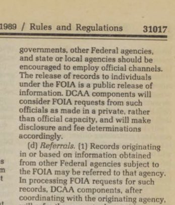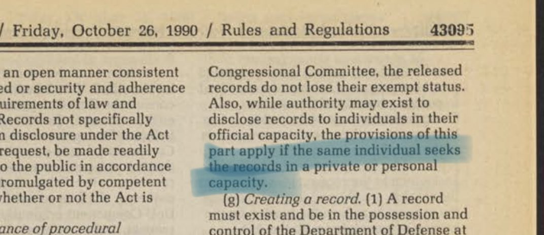 Oh, maybe you noticed this section that says 1 “Government organization may not file a request for information” on another. Note it cites to DOD’s FOIA reg, which then was identical to 32 CFR 286 & provided that officials absolutely had private & personal FOIA rights