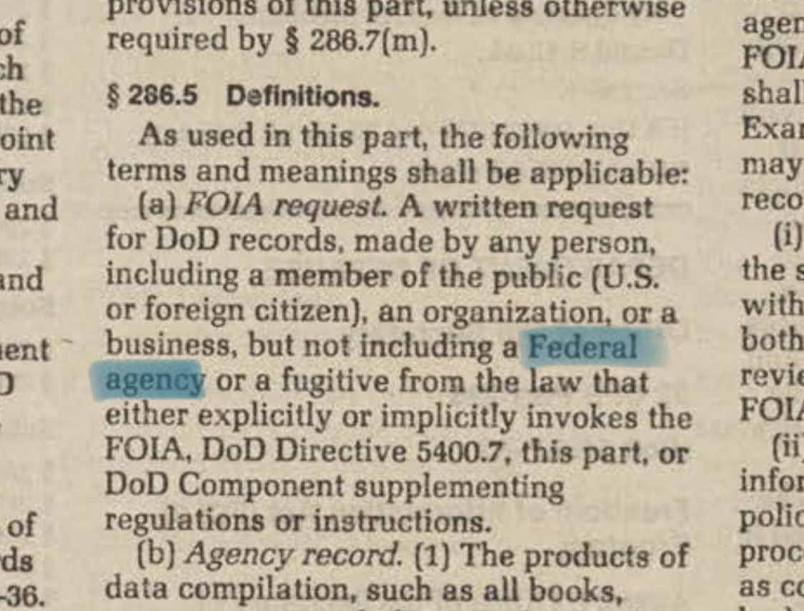 Ostensibly, DoD’s policy is based on the statutory definition of “person” excluding federal agencies, so “representatives of a federal agency” can’t seek records on behalf of an agency. But as far as I can find, DoD’s only ever issued a memo like this about 1 agency’s staff.
