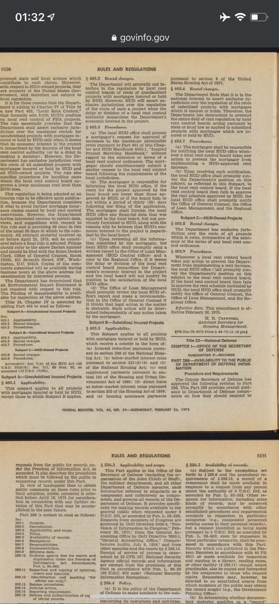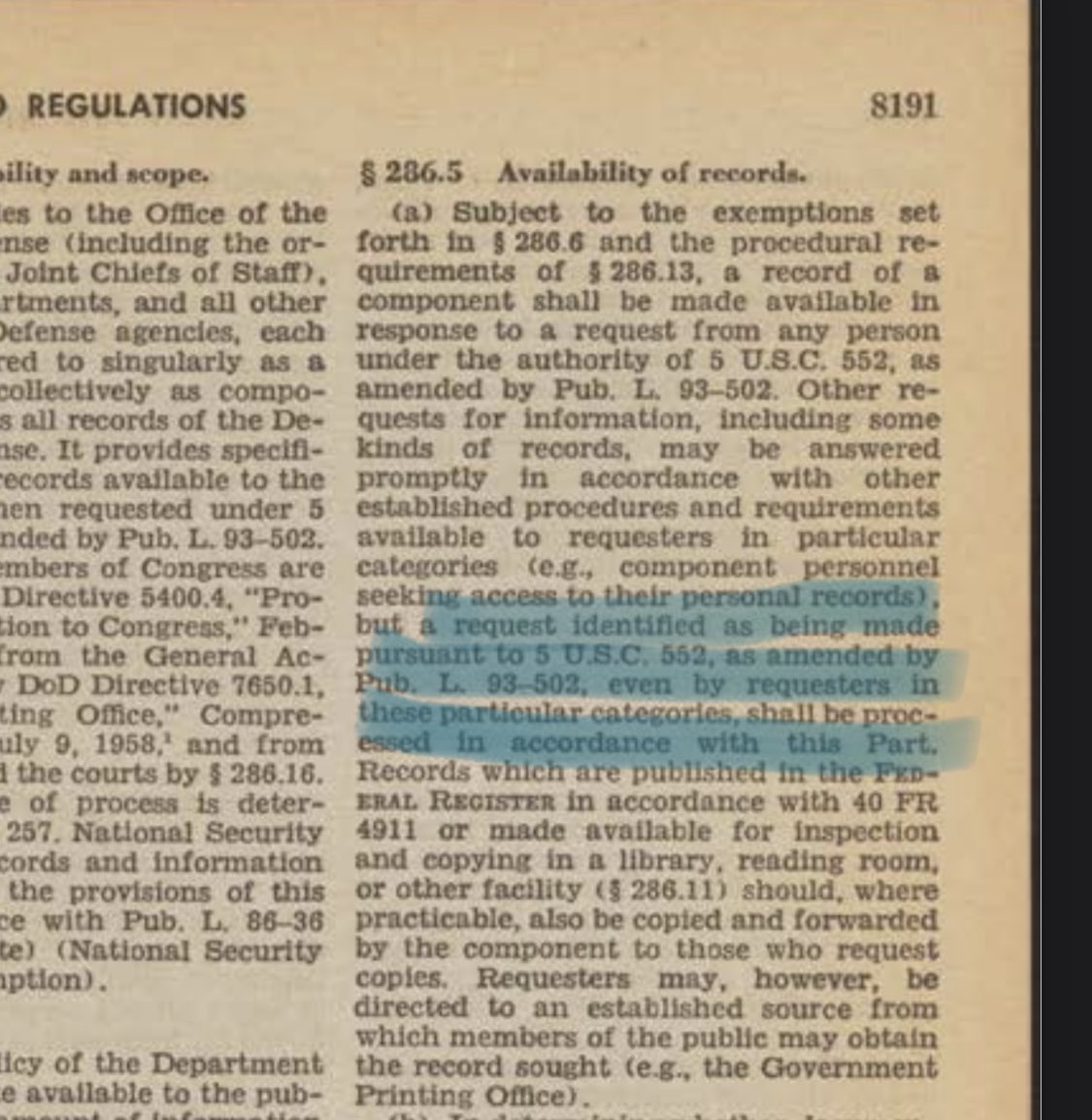 Recall that the basis of DOD’s policy denying S&S reporters’ FOIA rights is the statutory definition of “person.” That def hasn’t changed since 1946. So if these regs remained from 1975-2018, clearly the Act doesn’t *require* DoD to deny S&S reporters’ private FOIA rights.