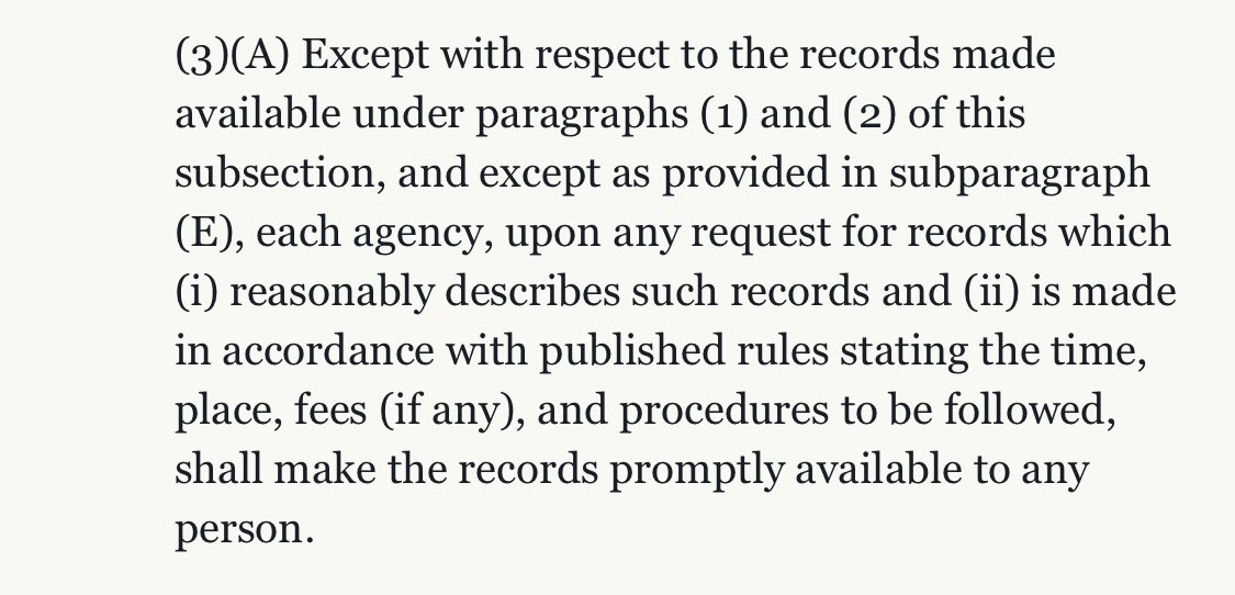 It’s ridiculous when you think about how the FOIA exists not to release records to certain people for certain approved uses, but to make MOST records open to ANYONE, for ANY REASON, provided only that they ask properly (i.e., in writing, specific, willing to pay fees, etc.).