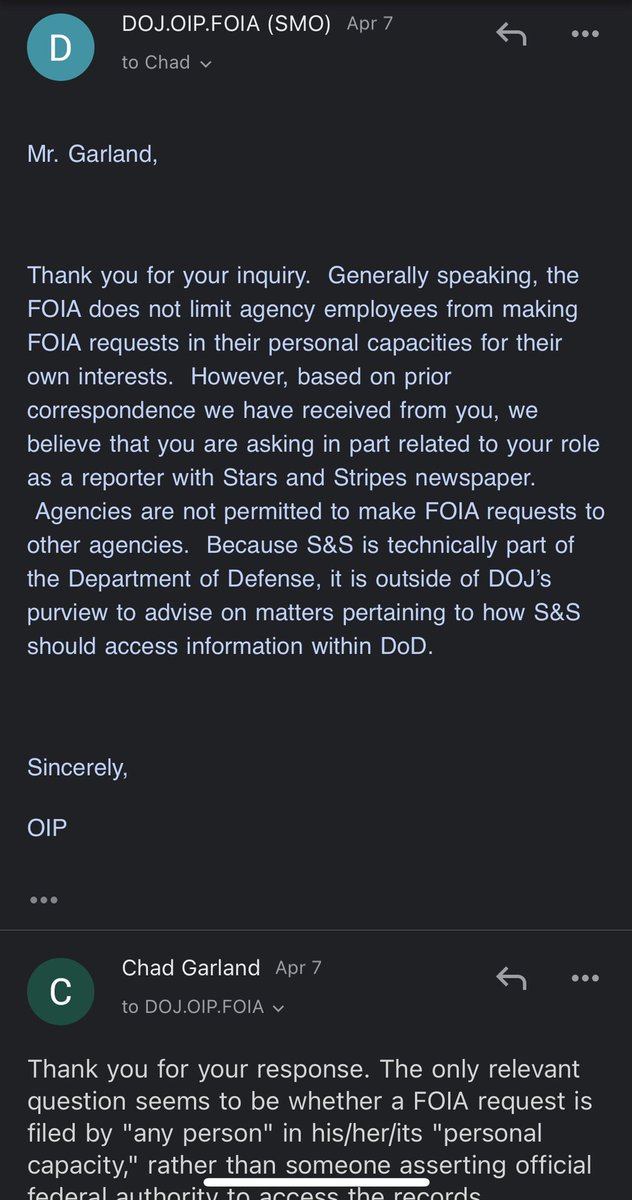 Then it says “because you are identified as a reporter on the Stars and Stripes website … you may not submit a FOIA request on behalf of the Stars and Stripes.” First of all, NO ONE can file a FOIA on behalf of S&S!