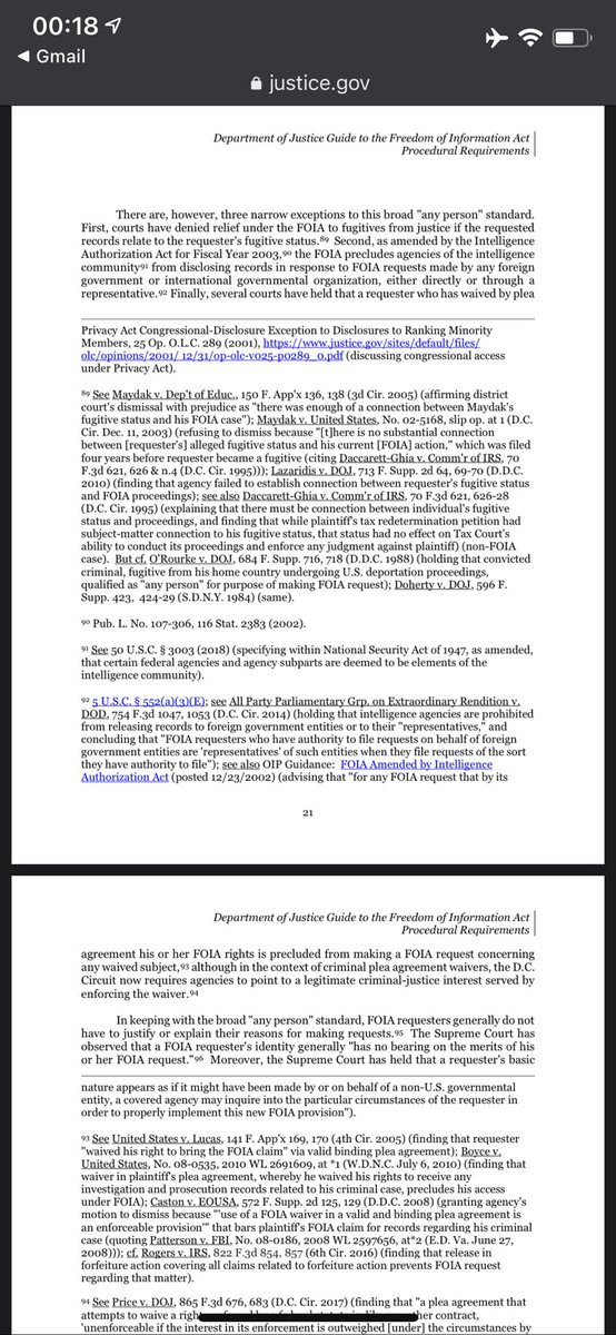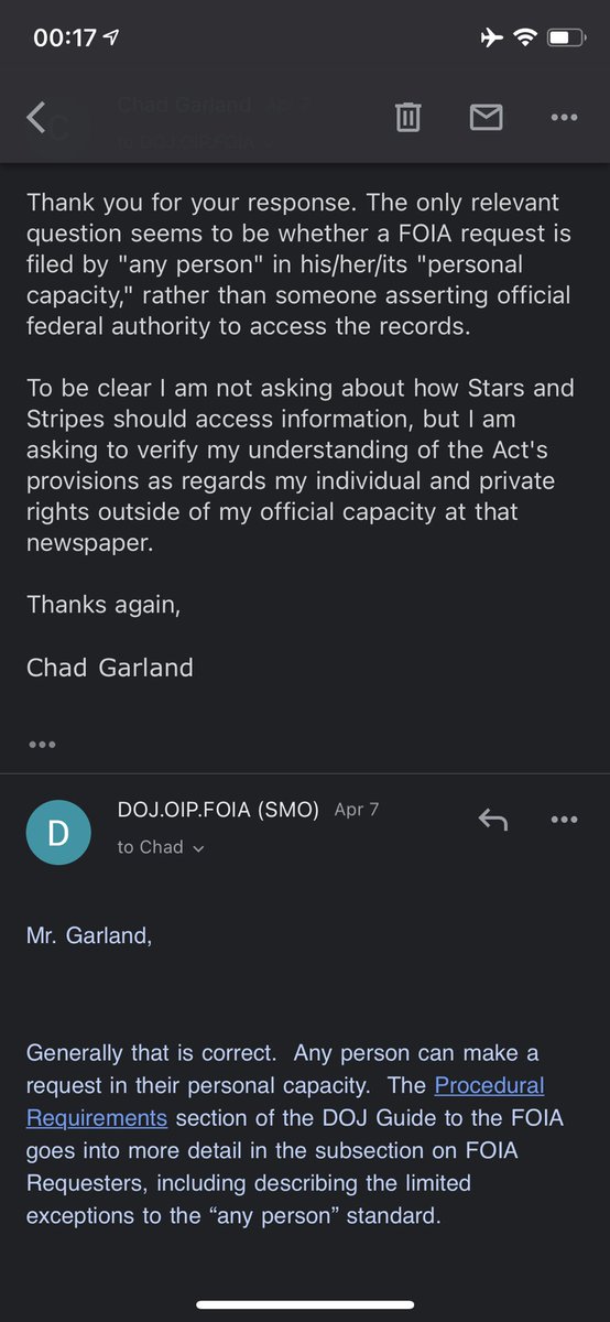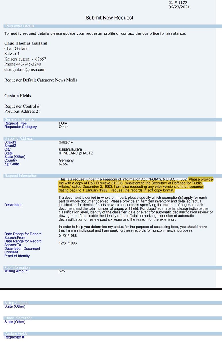 Also, there’s no requirement that a requester use his/her true name when making a request, so the whole DoD policy is insane. I could literally create a GMail account with a fictitious name and request all these records. The reason I don’t is bc I’m fighting for my own rights.