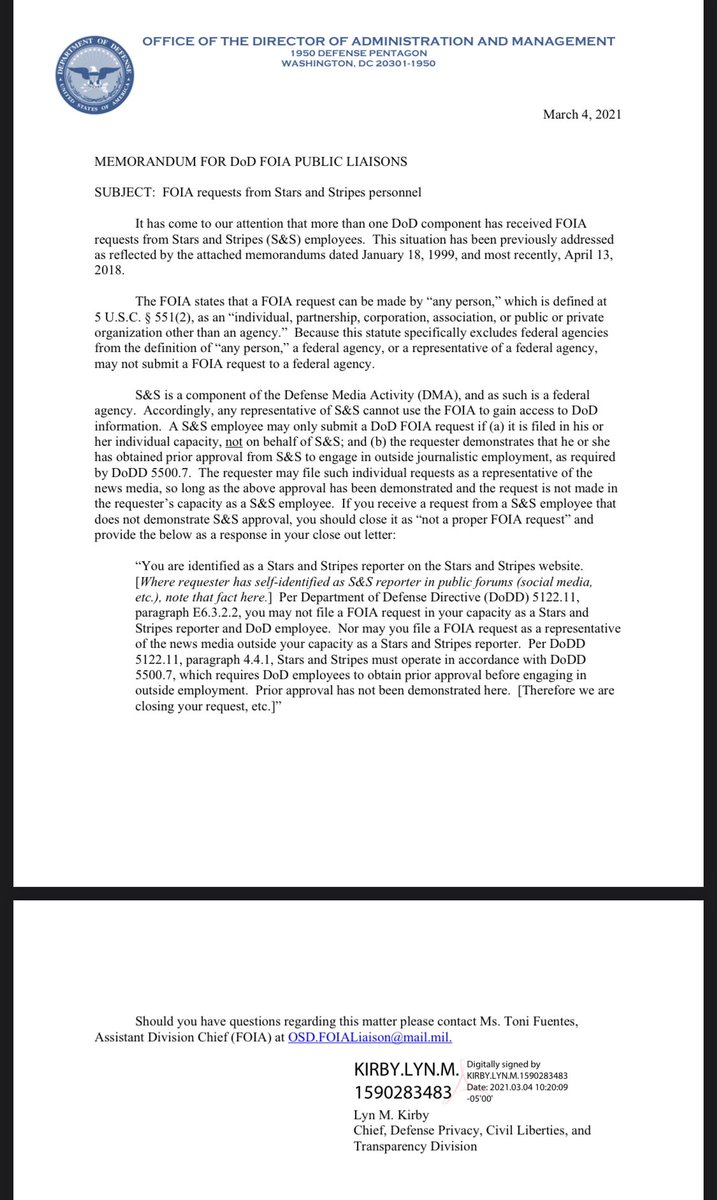 This new memo also bizarrely only allows S&S reporters to file FOIA requests with approval to engage in “outside journalistic employment,” apparently restricting an S&S employee’s personal rights only to paid work situations?!