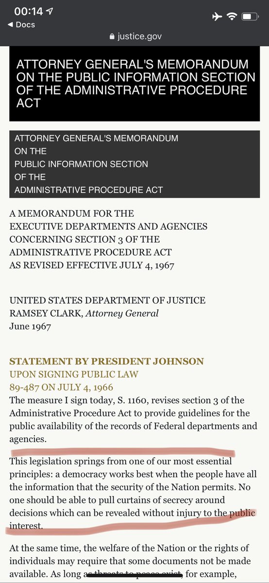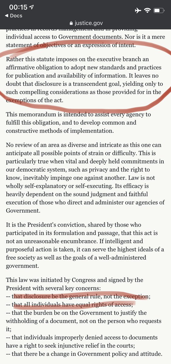 Here’s how President Johnson & Attorney General Clark described the FOIA and its aims when it was passed and took effect. ALL INDIVIDUALS have an equal right, disclosure limited only by exemptions, etc.