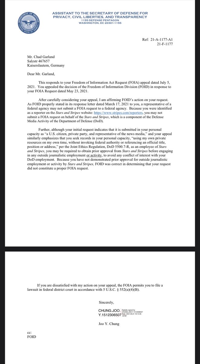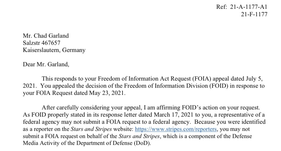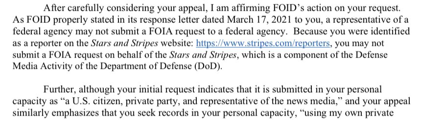I haven’t gotten paid for the time I’ve spent on 73 FOIA requests since May 2020, at least 30 of which have been denied initially and 22 of which have been denied on appeal (8 appeals pending or in draft) all solely on the basis that I am a Stars and Stripes reporter.