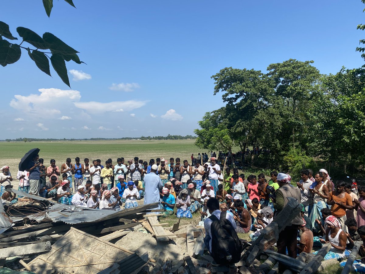 The residents of Dhalpur 3 gather for a prayer at the site where their mosque now stands demolished @Article14live