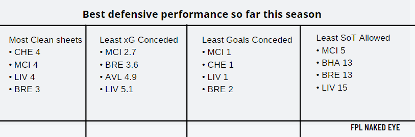 One thing for sure, newly promoted Brentford has been surprisingly good defensively. Moreover, all the big names like MCI, CHE, and LIV have all been good at defending as expected.