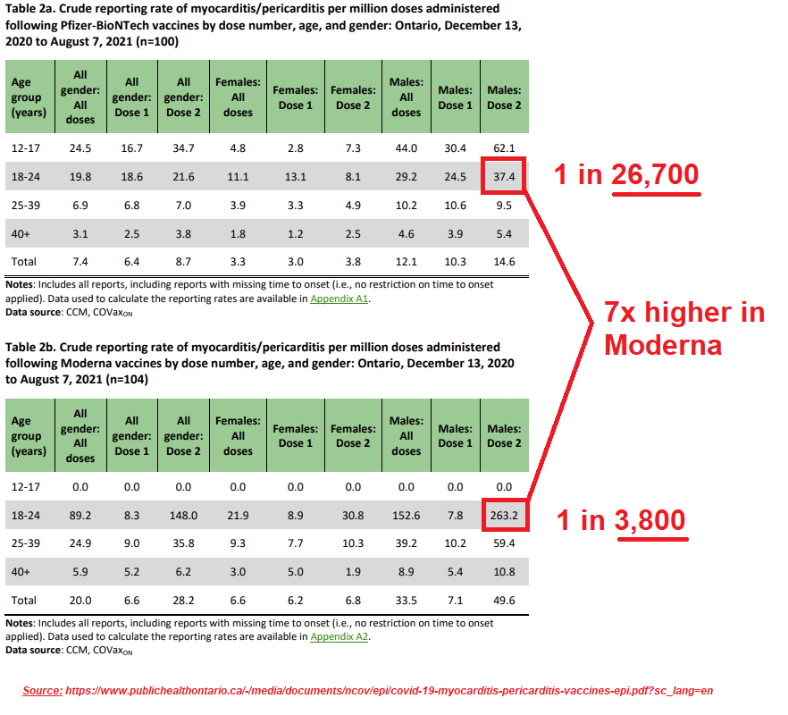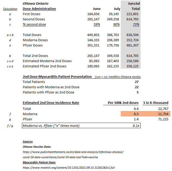 You can clearly see @sharon_kirky / @nationalpost likely did not review the detailed Ottawa dose data, usefully broken down by 1st/2nd doses & by Moderna/Pfizer. Simply stating aggregate ~830k doses vs. 32 myo cases (1 in 26,000) misinforms the public; the data is more nuanced !!
