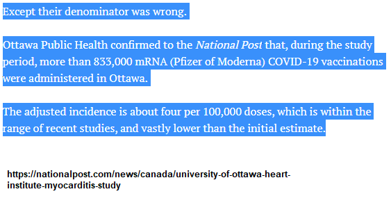 While @HeartInstitute made a big error in its denominator calculation, @sharon_kirky and @nationalpost do not appreciate that the aggregate data (32 cases and 830,000 doses) needs to be broken down in to 1st/2nd dose, Pfizer/Moderna, and age stratified.