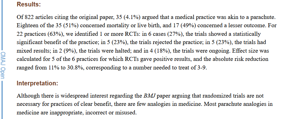 8/n Michael Hayes et coll dont Vinay Prasad, encore lui, avaient écrit un article le démontrant. Le terme "parachute" appliqué à une intervention était plutôt dû au spin, à l'exagération des bénéfices, qu'à la réalité de l’efficacité de l'intervention ncbi.nlm.nih.gov/pmc/articles/P…